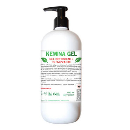 Kemina Gel Detergente Igienizzante 500ml Kemina Gel é una soluzione alcolica, in forma di gel, pronta all'uso per la pulizia e l'igienizzazione delle mani e delle superfici dure. Contiene alcool etilico ed isopropilico. Ha un'ottima tollerabilità cutanea, anche dopo un uso prolungato le mani restano morbide e lisce. Mantiene inalterato lo strato lipidico naturale, favorendo la rigenerazione della componente lipidica della cute nonché il ripristino del pH fisiologico. Ha azione immediata e prolungata nel tempo. Può essere utilizzata anche per la pulizia e l’igienizzazione di qualsiasi superfice dura usandola con della carta o straccio. Pratico gel utilizzabile in ogni situazione in cui si desidera pulire o igienizzare le mani. Fuori casa quando non si dispone di acqua e sapone (sui mezzi pubblici, dopo aver toccato denaro, ecc.); in casa, prima di cucinare o per rimuovere gli odori sgradevoli dalle mani (per es. in presenza di aglio, pesce ecc.) Modo d'uso Versare una piccola quantità di prodotto direttamente sulle mani e strofinare fino a completa asciugatura. Nel caso di utilizzo su superfici dure è sufficiente strofinare il prodotto con carta o straccio fino a completa asciugatura. È pratico, si usa senz'acqua, non unge, non appiccica la pelle, rimuove gli odori sgradevoli. Il pratico dosatore permette di erogare la giusta quantità di prodotto, evitando inutili sprechi. Può essere usato quando si necessita di un'igiene profonda e sicura, o come semplice precauzione per sé e per gli altri. Formato Flacone da 500 ml con dispenser.