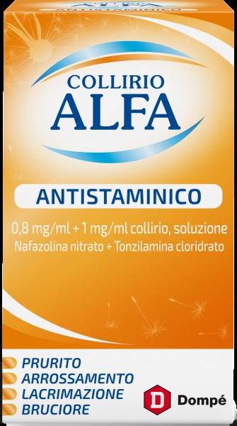 0,8 MG/ML + 1 MG/ML COLLIRIO, SOLUZIONE"FLACONE 10 ML" Denominazione COLLIRIO ALFA Antistaminico 0,8 mg/ml + 1 mg/ml collirio, soluzione Nafazolina nitrato e tonzilamina cloridrato Indicazioni terapeutiche Che cos’è e a che cosa serve COLLIRIO ALFA Antistaminico contiene i principi attivi nafazolina nitrato che appartiene al gruppo dei decongestionanti della mucosa oculare infiammata e tonzilamina cloridrato che appartiene al gruppo degli antiallergici ed allevia l'infiammazione oculare causata da allergie. COLLIRIO ALFA Antistaminico è utile quindi in caso di allergia ed infiammazione della mucosa, che ricopre il bulbo oculare e la parte interna delle palpebre (congiuntiva), accompagnate da fotofobia (ipersensibilità alla luce), lacrimazione, sensazione di corpi estranei nell'occhio.