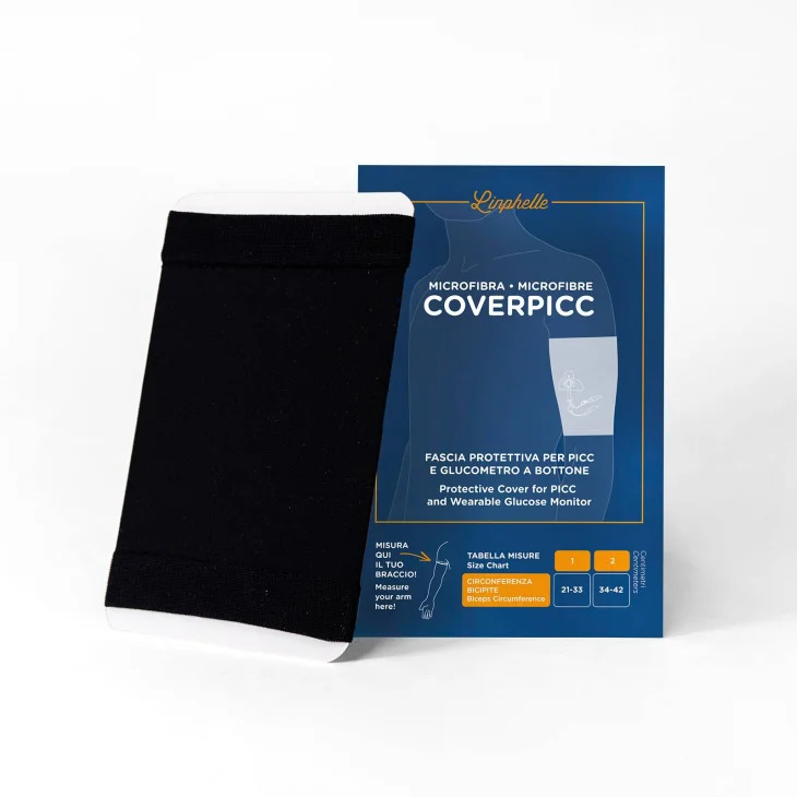 Protezione Per PICC In Microfibra Il Coverpicc in microfibra è una guaina dal design semplice ed elegante, progettata per proteggere dispositivi medici come il PICC e il glucometro a bottone. Il Coverpicc in microfibra è una guaina protettiva da indossare sopra il catetere per ritrovare libertà di movimento in ogni occasione della vita quotidiana. Non esercita alcuna compressione sull’arto e la parte interessata dai dispositivi medici ed è un accessorio dal design moderno e pratico. È disponibile in diverse tonalità monocolore e fantasie. Inoltre, il materiale scelto per la realizzazione è una microfibra fabbricata con filati Dryarn e Q-Skin. Ne risulta un tessuto eccezionalmente morbido, igienico, antibatterico ed altamente traspirante.