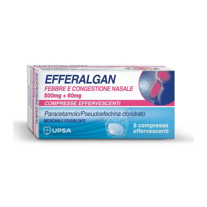Denominazione EFFERALGAN FEBBRE E CONGESTIONE NASALE 500 MG + 60 MG Avvertenze Durante il trattamento con paracetamolo, prima di assumere qualsiasi altro farmaco, controllare che non contenga lo stesso principio attivo,poiche' se il paracetamolo e' assunto in dosi elevate si possono verificare gravi reazioni avverse. Questo medicinale va usato correttamente, rispettando le istruzioni per l'uso ed in particolare la posologiaautorizzata. Si puo' verificare epatotossicita' con paracetamolo anchea dosi terapeutiche, dopo un trattamento di breve durata e in pazienti senza disfunzione epatica pre-esistente (vedere paragrafo 4.8). Si raccomanda cautela in pazienti con una storia di sensibilita' all'aspirina e/o ai farmaci antiinfiammatori non steroidei (FANS). Il rischio di gravi effetti indesiderati e' aumentato anche quando il paracetamoloe' assunto insieme ad altri analgesici antipiretici; deve pertanto essere evitato l'uso contemporaneo di questo tipo di medicinali. Questomedicinale puo' causare effetti indesiderati anche gravi (vedere paragrafo 4.8); il paziente deve essere avvertito di sospendere il medicinale e di consultare immediatamente un medico nel caso sospetti l'insorgenza di un effetto indesiderato grave. Gravi reazioni cutanee: con l'uso di paracetamolo sono state riportate reazioni potenzialmente fatalicome la sindrome di Stevens-Johnson (SSJ), la necrolisi epidermica tossica (NET) e la pustolosi esantematica acuta generalizzata. I pazienti devono essere informati circa i segni ed i sintomi e monitorati attentamente per le reazioni cutanee. Se si verificano i sintomi o i segnidella sindrome di Stevens-Johnson, della necrolisi epidermica tossicao della pustolosi esantematica acuta generalizzata (ad esempio rash cutaneo progressivo associato a vesciche o lesioni delle mucose), il paziente deve sospendere immediatamente il trattamento con paracetamoloe consultare un medico. Si consiglia cautela se il paracetamolo vienesomministrato in concomitanza con flucloxacillina a causa dell'aumentato rischio di acidosi metabolica con gap anionico elevato (HAGMA), inparticolare nei pazienti con grave compromissione renale, sepsi, malnutrizione e altre fonti di carenza di glutatione (ad es. alcolismo cronico), cosi' come in quelli che utilizzano le dosi massime giornalieredi paracetamolo. Si raccomanda un attento monitoraggio, inclusa la misurazione della 5-oxoprolina urinaria. Sindrome da encefalopatia posteriore reversibile (PRES) e sindrome da vasocostrizione cerebrale reversibile (RCVS): sono stati segnalati casi di PRES e RCVS con l'uso di prodotti contenenti pseudoefedrina (vedere paragrafo 4.8). Il rischio e'aumentato nei pazienti con ipertensione severa o non controllata, o con severa malattia renale acuta o cronica/insufficienza renale (vedereparagrafo 4.3). La pseudoefedrina deve essere interrotta e si deve richiedere assistenza medica immediata se si verificano i seguenti sintomi: improvvisa cefalea severa o cefalea a rombo di tuono, nausea, vomito, confusione, convulsioni e/o disturbi visivi. La maggior parte deicasi di PRES e RCVS segnalati si sono risolti dopo la sospensione e untrattamento appropriato. Neuropatia ottica ischemica: con la pseudoefedrina sono stati riportati casi di neuropatia ottica ischemica. La pseudoefedrina deve essere interrotta se dovesse verificarsi improvvisaperdita della vista o riduzione dell'acuita' visiva, ad esempio in caso di scotoma. Colite ischemica: ci sono state segnalazioni di colite ischemica con l'impiego di pseudoefedrina. L'utilizzo di pseudoefedrinadeve essere interrotto immediatamente e va richiesto un parere medicose si verificano all'improvviso dolore addominale, sanguinamento rettale o altri sintomi di colite ischemica. L'uso del medicinale richiedeuna accurata valutazione del rapporto rischio/beneficio negli anzianie nei soggetti affetti da una forma lieve/moderata delle seguenti malattie: malattia coronarica (angina, precedente infarto); ipertensione;aritmie; insufficienza epatica; insufficienza renale; ipertiroidismo;asma; diabete; disturbi della minzione causati da ipertrofia prostatica o da altre patologie; glaucoma; anemia emolitica; carenza di glucosio-6-fosfato deidrogenasi. I pazienti che assumono paracetamolo devonoevitare l'uso di bevande alcoliche perche' l'alcool aumenta il rischio di danno epatico. I forti consumatori di bevande alcoliche devono consultare il proprio medico prima di assumere un medicinale contenenteparacetamolo. Durante l'uso di EFFERALGAN FEBBRE E CONGESTIONE NASALEoccorre evitare di bere aranciata amara (vedere paragrafo 4.5). In corso di terapia con anticoagulanti orali la somministrazione di paracetamolo puo' aumentare l'effetto degli anticoagulanti rendendo necessarioun piu' stretto monitoraggio della terapia anticoagulante; inoltre, interazioni potenzialmente dannose sono possibili anche con diversi altri farmaci (vedere paragrafo 4.5). In questi casi Efferalgan Febbre eCongestione Nasale puo' essere utilizzato solo sotto stretto controllomedico. Il paziente deve essere avvertito della necessita' di consultare il medico se e' gia' in trattamento con altri farmaci. Rischi di abuso: la pseudoefedrina comporta il rischio di abuso. Dosi aumentate possono sostanzialmente causare tossicita'. L'uso continuativo puo' portare alla tolleranza, con conseguente aumento del rischio di sovradosaggio. La dose massima raccomandata e la durata del trattamento non devono essere superate (vedere paragrafo 4.2). Informazioni importanti sualcuni eccipienti - granulato per soluzione orale. Questo medicinalecontiene, aspartame: questo medicinale contiene 45,307mg di aspartameper bustina di granulato di soluzione orale, equivalente a 0,65 mg/kge 0,91 mg/kg rispettivamente in soggetti di 70 kg e 50 kg. L'aspartameingerito oralmente e' idrolizzato nel tratto gastrointestinale. La fenilalanina e' il principale prodotto della sua idrolisi. Puo' essere dannoso per i soggetti affetti da fenilchetonuria. Eccipienti Granulato per 