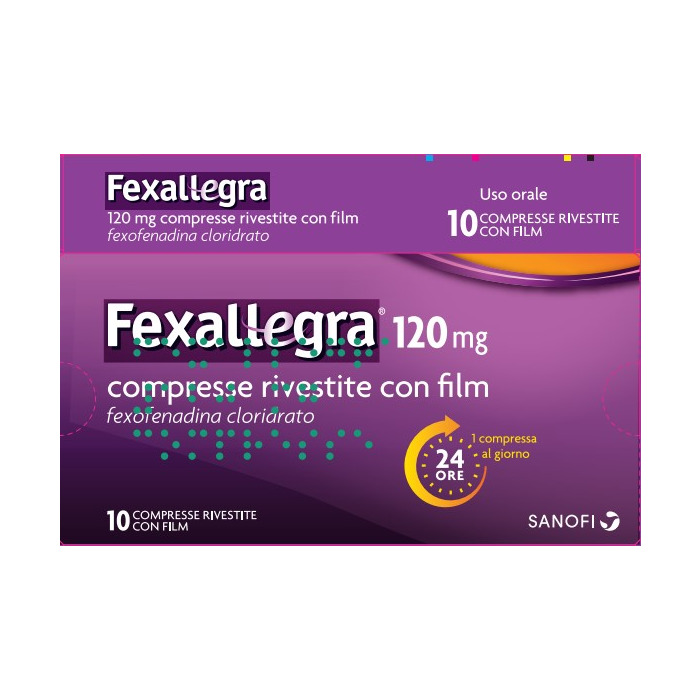 Indicazioni Fexallegra è indicato negli adulti e nei bambini a partire dai 12 anni di età per il trattamento sintomatico della rinite allergica stagionale. Posologia Posologia Adulti La dose raccomandata di fexofenadina cloridrato per gli adulti è di 120 mg una volta al giorno, prima dei pasti. La fexofenadina è un metabolita farmacologicamente attivo della terfenadina. Popolazione pediatrica Bambini di 12 anni di età e oltre La dose raccomandata di fexofenadina cloridrato per i bambini a partire dai 12 anni di età è di 120 mg una volta al giorno, prima dei pasti. Bambini al di sotto dei 12 anni di età L’efficacia e la sicurezza di fexofenadina cloridrato 120 mg non sono state studiate nei bambini al di sotto dei 12 anni di età. Nei bambini da 6 a 11 anni di età: fexofenadina cloridrato 30 mg compresse è la formulazione appropriata per la somministrazione e il dosaggio in questa popolazione. Popolazioni particolari Gli studi effettuati in gruppi di pazienti a rischio (anziani, pazienti con insufficienza renale o epatica) indicano che non è necessario adattare la dose di fexofenadina cloridrato in questi pazienti. Avvertenze Come nella maggior parte dei medicinali nuovi i dati relativi a soggetti anziani e a pazienti con compromissione della funzionalità renale o epatica sono limitati. Fexofenadina cloridrato deve essere somministrata con attenzione a tali gruppi di soggetti. Pazienti affetti da malattie cardiovascolari pregresse o in corso devono essere informati che gli antistaminici, come classe di medicinali, sono stati associati con reazioni indesiderate quali tachicardia e palpitazioni. Interazioni La fexofenadina non subisce biotrasformazioni epatiche e perciò non interagirà con altri medicinali a livello di meccanismi epatici. È stato riscontrato che la somministrazione contemporanea di fexofenadina cloridrato e eritromicina o ketoconazolo aumenta di 2–3 volte i livelli plasmatici di fexofenadina. Tali alterazioni non sono state accompagnate da alcun effetto sull’intervallo QT e non sono state associate ad alcun incremento delle reazioni avverse rispetto a quanto osservato con gli stessi medicinali somministrati singolarmente. Studi sull’animale hanno dimostrato che l’aumento dei livelli plasmatici di fexofenadina osservato dopo il trattamento concomitante con eritromicina o ketoconazolo sembra essere causato da un incremento dell’assorbimento gastrointestinale e rispettivamente da una diminuzione sia dell’escrezione biliare che della secrezione gastrointestinale. Non è stata osservata interazione tra fexofenadina e omeprazolo. Tuttavia, la somministrazione di un antiacido contenente alluminio e idrossido di magnesio 15 minuti prima della somministrazione di fexofenadina cloridrato ha provocato una riduzione della biodisponibilità, molto probabilmente dovuta a legami nel tratto gastrointestinale. È consigliabile un intervallo di 2 ore tra la somministrazione di fexofenadina cloridrato e antiacidi contenenti alluminio e idrossido di magnesio. Effetti Indesiderati E’ stata utilizzata la seguente classe di frequenze, quando applicabile: molto comune ? 1/10; comune ? 1/100 e < 1/10; non comune ? 1/1000 e < 1/100; raro ? 1/10.000 e < 1/1.000); molto raro < 1/10.000 e non nota (la frequenza non può essere valutata sulla base dei dati disponibili). All’interno di ogni gruppo di frequenza, gli effetti indesiderati sono presentati in ordine di gravità decrescente.Negli adulti, nell’ambito degli studi clinici sono stati riferiti i seguenti effetti indesiderati, con un’incidenza simile a quella osservata con il placebo: Patologie del sistema nervoso Comune: cefalea, sonnolenza, vertigini. Patologie gastrointestinali Comune: nausea. Patologie sistemiche e condizioni relative alla sede di somministrazione Non comune: affaticamento. Negli adulti, nell’ambito della sorveglianza post–marketing sono stati riferiti i seguenti effetti indesiderati. La frequenza con cui si presentano non è nota (non può essere fatta una stima sulla base dei dati disponibili): Disturbi del sistema immunitario Reazioni di ipersensibilità con manifestazioni tipo angioedema, oppressione toracica, dispnea, vampate di calore e anafilassi sistemica. Disturbi psichiatrici Insonnia, nervosismo, disturbi del sonno o incubi/eccesso di sogni (paroniria). Patologie cardiache Tachicardia, palpitazioni. Patologie gastrointestinali Diarrea. Patologie della cute e del tessuto sottocutaneo Rash, orticaria e prurito. Segnalazione delle reazioni avverse sospette La segnalazione delle reazioni avverse sospette che si verificano dopo l’autorizzazione del medicinale è importante, in quanto permette un monitoraggio continuo del rapporto beneficio/rischio del medicinale. Agli operatori sanitari è richiesto di segnalare qualsiasi reazione avversa sospetta tramite il sistema nazionale di segnalazione all’indirizzo www.agenziafarmaco.gov.it/it/responsabili. Gravidanza Gravidanza Non vi sono dati adeguati sull’uso della fexofenadina cloridrato nelle donne in gravidanza. Studi limitati su animali non indicano effetti dannosi diretti o indiretti su gravidanza, sviluppo embrionale/fetale, parto o sviluppo post–natale. La fexofenadina cloridrato non deve essere usata durante la gravidanza se non in caso di assoluta necessità. Allattamento Non vi sono dati sulla concentrazione nel latte materno dopo la somministrazione della fexofenadina cloridrato. Tuttavia, quando la terfenadina è stata somministrata a madri in allattamento, è stato rilevato che la fexofenadina passa nel latte materno. Pertanto l’uso di fexofenadina cloridrato non è raccomandato durante l’allattamento. Formato Confezione da 10 compresse rivestite.
