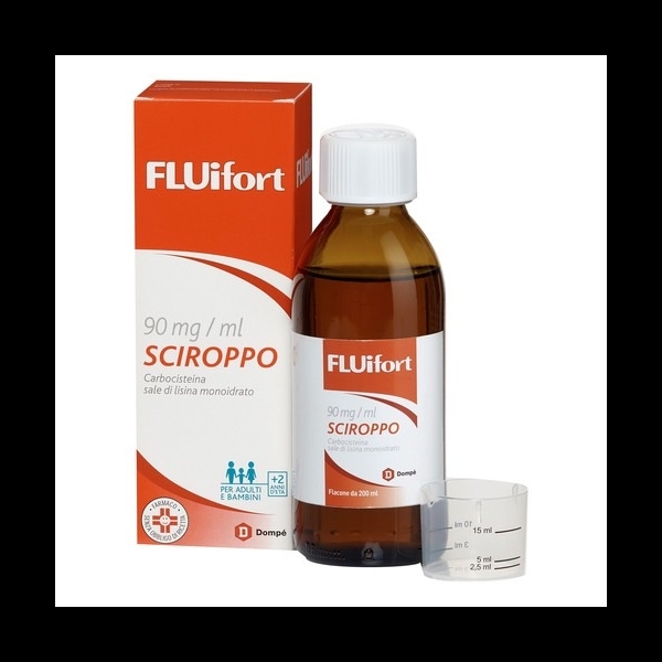 Principi attivi 100 ml di sciroppo contengono: Principio attivo: carbocisteina sale di lisina monoidrato pari a 9 g di carbocisteina sale di lisina. Eccipienti: saccarosio, metile para-idrossibenzoato. Per l’elenco completo degli eccipienti, vedere paragrafo 6.1. Eccipienti Saccarosio, aroma naturale di ciliegia, metile para-idrossibenzoato, caramello, acqua depurata. Indicazioni terapeutiche Mucolitico, fluidificante nelle affezioni dell’apparato respiratorio acute e croniche. Controindicazioni/Effetti indesiderati Ipersensibilità al principio attivo o ad uno qualsiasi degli eccipienti. Ulcera gastroduodenale. Gravidanza ed allattamento. Il farmaco è controindicato nei bambini di età inferiore ai 2 anni. Posologia Alla confezione è annesso un bicchiere dosatore graduato.Per aprire la confezione è necessario premere con forza il tappo e ruotare contemporaneamente in senso antiorario. Adulti: 15 ml 2-3 volte al dì o secondo prescrizione medica Bambini: oltre i 5 anni: 5 ml 2-3 volte al dì o secondo prescrizione medica da 2 a 5 anni: 2,5 ml 2-3 volte al dì o secondo prescrizione medica. In considerazione delle caratteristiche farmacocinetiche, la posologia consigliata può essere mantenuta anche in pazienti con insufficienza renale ed epatica. Durata del trattamento: carbocisteina sale di lisina monoidrato può essere impiegata anche per periodi prolungati, in questo caso è opportuno seguire i consigli del medico. Conservazione Non conservare al di sopra di 25° C. Avvertenze I mucolitici possono indurre ostruzione bronchiale nei bambini di età inferiore ai 2 anni. Infatti la capacità di drenaggio del muco bronchiale è limitata in questa fascia d’età, a causa delle caratteristiche fisiologiche delle vie respiratorie. Essi non devono quindi essere usati nei bambini di età inferiore ai 2 anni (vedere paragrafo 4.3). Non sono noti fenomeni di assuefazione o dipendenza. Pazienti con rari problemi ereditari di intolleranza al glucosio, malassorbimento di glucosio-galattosio o insufficienza dell’enzima saccarosio-isomaltasi non devono assumere questo medicinale. Il medicinale contiene metile para-idrossibenzoato, noto per la possibilità di causare orticaria. In generale i para-idrossibenzoati possono causare reazioni ritardate, tipo la dermatite da contatto e raramente reazioni immediate con manifestazione di orticaria e broncospasmo. Fluifort 90 mg/ml sciroppo non contiene glutine; pertanto può essere somministrato a pazienti affetti da celiachia. Fluifort 90 mg/ml sciroppo non contiene aspartame; pertanto può essere somministrato a pazienti affetti da fenilchetonuria. Interazioni In studi clinici controllati non sono state evidenziate interazioni con i più comuni farmaci di impiego nel trattamento delle affezioni delle vie aeree superiori ed inferiori nè con alimenti e con test di laboratorio. Effetti indesiderati Gli effetti indesiderati che possono verificarsi con Fluifort, classificati per sistemi e organi (SOC), sono i seguenti: Patologie della cute, del tessuto sottocutaneo: rash cutaneo, orticaria, eritema, esantema, esantema/eritema bolloso, prurito, angioedema, dermatite. Patologie gastrointestinali: dolore addominale, nausea, vomito, diarrea. Patologie del sistema nervoso: vertigini. Patologie respiratorie, toraciche e mediastiniche: dispnea. Patologie vascolari: rossore. Con i mucolitici per uso orale e rettale si può anche verificare ostruzione bronchiale con frequenza sconosciuta. Sovradosaggio I sintomi riportati in caso di sovradosaggio sono: mal di testa, nausea, vomito, diarrea, gastralgia, reazioni cutanee, alterazione dei sistemi sensoriali. Non esiste un antidoto specifico; si consiglia di provocare il vomito ed eventualmente di eseguire lavanda gastrica seguita da terapia di supporto specifica. Gravidanza e allattamento Sebbene il principio attivo non risulti né teratogeno né mutageno e non abbia mostrato effetti negativi sulla funzione riproduttiva nell’animale, Fluifort non deve essere somministrato in gravidanza (vedere 4.3). Poiché non sono disponibili dati relativi al passaggio di carbocisteina sale di lisina monoidrato nel latte materno, l’uso durante l’allattamento è controindicato (vedere 4.3).