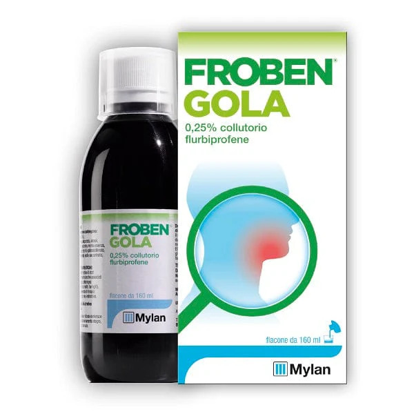 Indicazioni terapeuticheFroben Gola è indicato per il trattamento sintomatico di stati irritativo-infiammatori anche associati a dolore del cavo orofaringeo (ad es. gengiviti, stomatiti, faringiti), anche in conseguenza di terapia dentaria conservativa o estrattiva.Posologia e modalità d'usoGli effetti indesiderati possono essere minimizzati con l’uso della più bassa dose efficace per la più breve durata possibile di trattamento che occorre per controllare i sintomi (vedere paragrafo 4.4). Si raccomanda l’utilizzo di questo medicinale per un massimo di tre giorni. Posologia: • COLLUTORIO La dose raccomandata è di due o tre risciacqui o gargarismi al giorno con 10 ml di collutorio. Può essere diluito in acqua • SPRAY PER MUCOSA ORALE La dose raccomandata è di 2 spruzzi 3 volte al giorno indirizzati direttamente sulla parte interessata. Popolazione pediatrica Non sono disponibili dati adeguati sulla popolazione pediatrica; pertanto l’utilizzo del medicinale non è raccomandato.ControindicazioniIpersensibilità al flurbiprofene o ad uno qualsiasi degli eccipienti elencati al paragrafo 6.1. Froben Gola è inoltre controindicato in: • pazienti che hanno precedentemente manifestato reazioni di ipersensibilità (ad es. asma, orticaria) dopo aver assunto aspirina o altri fans. • pazienti con storia di emorragia gastrointestinale o perforazione correlata a precedenti trattamenti con fans. • pazienti con colite ulcerosa attiva o anamnestica, morbo di crohn, ulcera peptica ricorrente o emorragia gastrointestinale (definita come due o più episodi distinti di dimostrata ulcerazione o sanguinamento). • pazienti con grave insufficienza cardiaca, renale o epatica (vedere paragrafo 4.4). Froben Gola è controindicato durante il terzo trimestre di gravidanza.Effetti indesideratiLe seguenti reazioni avverse, segnalate in particolare dopo la somministrazione di formulazioni ad uso sistemico, sono riportate secondo la classificazione MedDRA. I raggruppamenti di frequenza sono classificati in accordo alla seguente convenzione: molto comune (? 1/10), Comune (?1/100 to <1/10), Non comune (?1/1000 a <1/100), Raro (? 1/10.000 to <1/1000), Molto raro (<1/10.000) e Non Noto (la frequenza non può essere stimata). Classificazione per sistemi e organi secondo MedDRA Frequenza Reazione Avversa Patologie del sistema emolinfopoietico Non comune Anemia Molto raro Leucopenia, agranulocitosi, anemia aplastica, neutropenia, trombocitopenia, anemia emolitica. Disturbi del sistema immunitario Non comune Ipersensibilità Raro Reazione anafilattica Disturbi psichiatrici Raro Depressione, Stato confusionale Molto raro Allucinazione Patologie del Sistema Nervoso Comune Emicrania, capogiri Non comune Parestesia Raro Sonnolenza, Insonnia Non noto Neurite ottica, accidente cerebrovascolare, cefalea. Patologie dell’occhio Non comune Disturbi della vista Patologie dell’orecchio e del labirinto Non comune Tinnito, vertigine Patologie respiratorie, toraciche e mediastiniche Non comune Asma, dispnea Raro Broncospasmo Patologie gastrointestinali Comune Dispepsia, diarrea, nausea, vomito, dolore addominale, flatulenza, costipazione, melena, ematemesi, emorragia gastrointestinale Non comune Gastrite, ulcera duodenale, ulcera gastrica, ulcera della bocca, perforazione gastrointestinale Molto raro Pancreatite Non Noto Colite e Morbo di Crohn Patologie epatobiliari Molto raro Ittero, ittero colestatico, funzionalità epatica anormale Non noto Epatite Patologie della cute e del tessuto sottocutaneo Non comune Rash, orticaria, prurito, porpora,angioedema, reazioni di fotosensibilità Molto raro Forme severe di reazioni cutanee bollose (e.g.Eritema Multiforme, Sindrome di Stevens-Johnson e Necrolisi Tossica Epidermica) Patologie renali e urinarie Raro Nefrotossicità in varie forme i.e. nefrite interstiziale, sindrome nefrotica, insufficienza renale ed insufficienza renale acuta. (vedere paragrafo 4.4) Non noto Glomerulonefrite Patologie sistemiche e condizioni relative alla sede di somministrazione Comune Affaticamento, malessere, edema Patologie cardiache Non comune Insufficienza cardiaca Patologie vascolari Non comune Ipertensione Esami diagnostici Comune Test della funzionalità epatica anormale, prolungato tempo di sanguinamento Disturbi del metabolismo e della nutrizione Comune Ritenzione di fluidi Disturbi del sistema immunitario In seguito al trattamento con FANS sono state riportate reazioni di ipersensibilità. Queste consistono in: a) reazioni allergiche non specifiche ed anafilassi; b) reazioni a carico del tratto respiratorio comprendenti asma, anche grave, broncospasmo o dispnea, o c) diversi disturbi cutanei, quali eruzioni cutanee di vario tipo, prurito, orticaria, porpora, angioedema e, molto raramente, dermatiti esfoliative e bollose (inclusi Necrolisi Tossica Epidermica ed eritema multiforme). Patologie cardiache e vascolari Sono stati riportati casi di edema, ipertensione e insufficienza cardiaca in associazione al trattamento con FANS. Studi clinici e dati epidemiologici suggeriscono che l’assunzione di alcuni FANS (soprattutto se a dosaggi elevati e in caso di trattamento a lungo termine) può essere associato ad un aumento del rischio di eventi trombotici arteriosi (per esempio infarto del miocardio oppure ictus) (vedere paragrafo 4.4).Patologie del Sistema Nervoso Meningite asettica (specialmente in pazienti con disturbi autoimmuni esistenti come ad esempio Lupus Eritematoso Sistemico e disturbi del tessuto connettivo) con sintomi quali collo rigido, cefalea, nausea, vomito, febbre o disorientamento (vedere paragrafo 4.4). Segnalazione delle reazioni avverse sospette La segnalazione delle reazioni avverse sospette che si verificano dopo l’autorizzazione del medicinale è importante, in quanto permette un monitoraggio continuo del rapporto beneficio/rischio del medicinale. Agli operatori sanitari è richiesto di segnalare qualsiasi reazione avversa sospetta tramite il sistema nazionale di s
