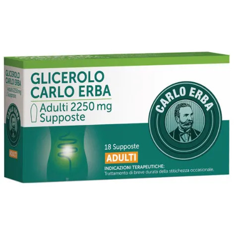 Descrizione Glicerolo Carlo Erba 18 Supposte Adulti 2250mg DENOMINAZIONE: GLICEROLO CARLO ERBA CATEGORIA FARMACOTERAPEUTICA: Lassativi. PRINCIPI ATTIVI: Prima infanzia 900 mg supposte: glicerolo 900 mg. Bambini 1375 mg supp oste: glicerolo 1375 mg. Adulti 2250 mg supposte: glicerolo 2250 mg. B ambini 2,25 g soluzione rettale: glicerolo 2,25 g. Adulti 6,75 g soluz ione rettale: glicerolo 6,75 g. ECCIPIENTI: Supposte: sodio stearato; sodio carbonato. Soluzione rettale: camomill a estratto fluido; malva estratto fluido; amido di frumento; acqua dep urata. INDICAZIONI: Trattamento di breve durata della stitichezza occasionale. CONTROINDICAZIONI/EFF.SECONDAR: Ipersensibilita' al principio attivo o ad uno qualsiasi degli eccipien ti; dolore addominale acuto o di origine sconosciuta; nausea o vomito; ostruzione o stenosi intestinale; sanguinamento rettale di origine sc onosciuta; crisi emorroidale acuta con dolore e sanguinamento; grave s tato di disidratazione. POSOLOGIA: La dose corretta e' quella minima sufficiente a produrre una facile ev acuazione. E' consigliabile usare inizialmente le dosi minime previste . Supposte. Adulti: 1 supposta adulti al bisogno, per un massimo di 1 o 2 somministrazioni al giorno. Popolazione pediatrica. Adolescenti (1 2 - 18 anni): 1 supposta adulti al bisogno, per un massimo di 1 o 2 so mministrazioni al giorno. Bambini di eta' compresa tra 2 - 11 anni: 1 supposta bambini al bisogno, per un massimo di 1 o 2 somministrazioni al giorno. Bambini di eta' compresa tra 1 mese e 2 anni: 1 supposta pr ima infanzia al bisogno, per un massimo di 1 o 2 somministrazioni al g iorno. Soluzione rettale. Adulti: 1 contenitore monodose adulti al bis ogno, per un massimo di 1 o 2 somministrazioni al giorno. Popolazione pediatrica. Adolescenti (12 - 18 anni): 1 contenitore monodose adulti al bisogno, per un massimo di 1 o 2 somministrazioni al giorno. Bambin i di eta' compresa tra i 6 - 11 anni: 1 o 2 contenitori monodose bambi ni al bisogno, per un massimo di 1 o 2 somministrazioni al giorno. Bam bini di eta' compresa tra i 2 - 6 anni: 1 contenitore monodose bambini al bisogno per un massimo di 1 o 2 somministrazioni al giorno. Modo d i somministrazione. Supposte: togliere la supposta dal suo contenitore e poi, se necessario, inumidirla per facilitarne l'introduzione retta le. Qualora le supposte apparissero rammollite immergere i contenitori , prima di aprirli, in acqua fredda. Soluzione rettale: per togliere i l copricannula di sicurezza del contenitore monodose, appoggiare indic e e pollice sulla ghiera rotonda posta sopra il soffietto e, con l'alt ra mano, piegare il copricannula fino a provocarne il distacco del cor po del contenitore. Durante l'operazione, non afferrare mai il soffiet to, altrimenti si verificherebbe la fuoriuscita del medicinale prima d ell'utilizzo. Puo' essere utile lubrificare la cannula con una goccia della soluzione stessa, prima di introdurla nel retto e premere il sof fietto. Estrarre la cannula tenendo premuto il soffietto. Ogni conteni tore deve essere utilizzato per una sola somministrazione; eventuale m edicinale residuo deve essere eliminato. Nei bambini sotto i dodici an ni il medicinale puo' essere utilizzato solo dopo aver consultato il m edico. I lassativi devono essere usati il meno frequentemente possibil e e per non piu' di sette giorni. Una dieta ricca di liquidi favorisce l'effetto del medicinale. CONSERVAZIONE: Conservare nella confezione originale per proteggere il medicinale dal l'umidita' e lontano da fonti dirette di calore. AVVERTENZE: I lassativi devono essere usati il meno frequentemente possibile e per non piu' di sette giorni. L'uso per periodi di tempo maggiori richied e la prescrizione del medico dopo adeguata valutazione del singolo cas o. Il trattamento della stitichezza cronica o ricorrente, richiede sem pre l'intervento del medico per la diagnosi, la prescrizione dei farma ci e la sorveglianza nel corso della terapia. E' inoltre opportuno che i soggetti anziani o in non buone condizioni di salute, consultino il medico prima di usare il medicinale. L'abuso di lassativi puo' causar e diarrea persistente con conseguente perdita di acqua, sali minerali (specialmente potassio) ed altri fattori nutritivi essenziali. Nei cas i piu' gravi di abuso e' possibile l'insorgenza di disidratazione o ip opotassiemia, la quale puo' determinare disfunzioni cardiache o neurom uscolari, specialmente in caso di trattamento contemporaneo di glicosi di cardiaci, diuretici o corticosteroidi. L'abuso di lassativi, specia lmente quelli di contatto (lassativi stimolanti), puo' causare dipende nza (e, quindi, possibile necessita' di aumentare progressivamente il dosaggio), stitichezza cronica e perdita delle normali funzioni intest inali (atonia intestinale). Negli episodi di stitichezza, si consiglia innanzitutto di correggere le abitudini alimentari integrando la diet a quotidiana con un adeguato apporto di fibre ed acqua. Quando si util izzano lassativi e' opportuno bere al giorno almeno 6-8 bicchieri di a cqua, o altri liquidi, in modo da favorire l'ammorbidimento delle feci . INTERAZIONI: Non sono stati effettuati studi specifici di interazione. EFFETTI INDESIDERATI: Frequenze reazioni avverse: molto comune >=1/10; comune >=1/100, <1/10 ; non comune >=1/1.000, <1/100; raro >=1/10.000, <1/1.000; molto raro <1/10.000; non nota. Patologie gastrointestinali. Non nota: dolori cra mpiformi dell'addome; coliche addominali, diarrea, irritazione anale. Dolori crampiformi isolati o coliche addominali e diarrea sono piu' fr equenti nei casi di stitichezza grave. Segnalare qualsiasi reazione av versa sospetta tramite il sistema nazionale di segnalazione. GRAVIDANZA E ALLATTAMENTO: Non sono stati effettuati studi adeguati e ben controllati sull'uso de l medicinale in gravidanza o nell'allattamento. Anche se non ci sono e videnti controindicazioni dell'uso del medicinale in gravidanza e dura nte l'allattamento, si raccomanda di assumere il medicinale solo