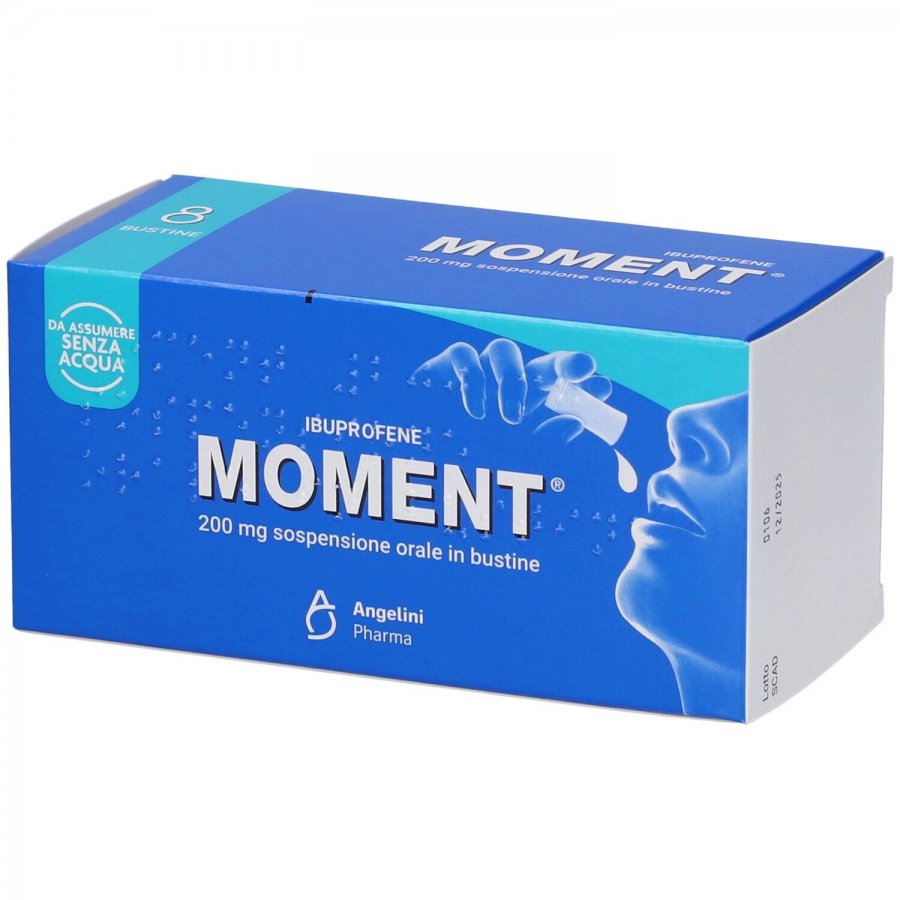 DESCRIZIONE PRODOTTO: Angelini Moment offre rapido sollievo da una vasta gamma di dolori, tra cui mal di testa, mal di denti, nevralgie, dolori osteo-articolari e muscolari, oltre ad essere un coadiuvante nel trattamento sintomatico di stati febbrili e influenzali. Ogni bustina di sospensione orale contiene 200mg di principio attivo. MODALITÀ D’USO: Sciogliere il contenuto di una bustina in un bicchiere d'acqua e assumere per via orale. Ripetere l'assunzione ogni 4-6 ore secondo necessità, senza superare le dosi consigliate. Consultare il medico prima dell'uso, soprattutto in caso di trattamenti prolungati. INGREDIENTI: Principio attivo: 200mg di naprossene POSOLOGIA: Adulti e adolescenti dai 12 anni: 1 bustina ogni 4-6 ore, se necessario. Non superare le 3 bustine al giorno. FORMATO: Confezione da 8 bustine di sospensione orale.