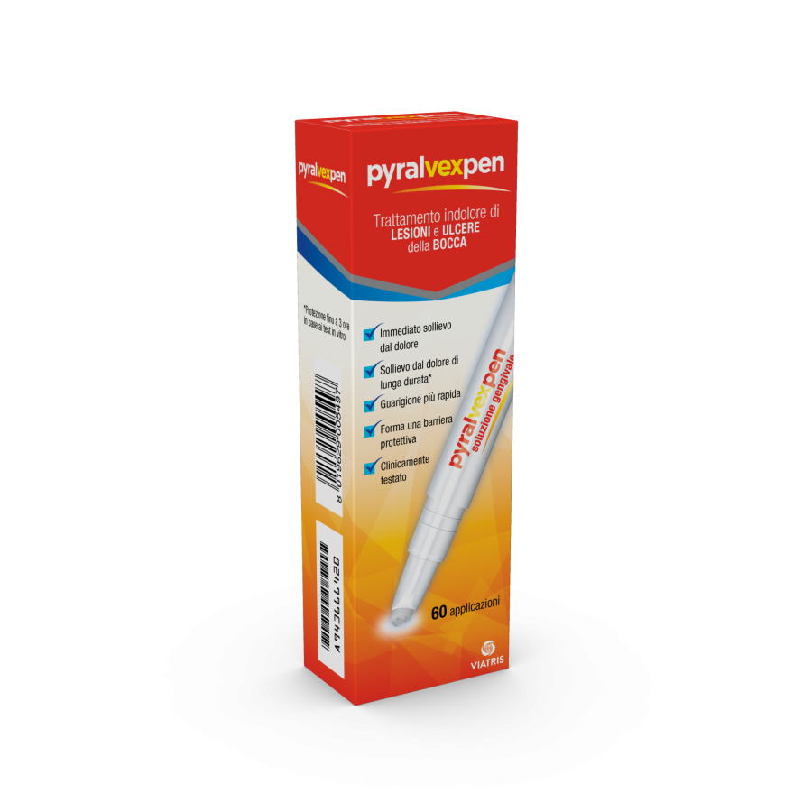 Principi attivi 10 ml contengono: "Principi attivi - Estratto glucosidico di rabarbaro 0,5 g (corrispondente a 0,43-0,53% m/v di derivati antrachinonici) - Acido salicilico 0,1 g Eccipiente con effetti noti: - Etanolo..................59,5% v/v Per l'elenco completo degli eccipienti, vedere paragrafo 6.1. Eccipienti Etanolo, acqua depurata. Indicazioni terapeutiche Gengiviti, stomatiti, orofaringiti, coadiuvante nella terapia della piorrea alveolare. Controindicazioni/Effetti indesiderati Ipersensibilità ai principi attivi o ad uno qualsiasi degli eccipienti elencati al paragrafo 6.1. Non deve essere usato nei bambini al di sotto di 12 anni di età. Con l’applicazione topica di acido salicilico esiste un rischio ipotetico di indurre la Sindrome di Reye. È stata osservata Sindrome di Reye dopo somministrazione orale di dosi più alte di acido salicilico o acido acetilsalicilico nei bambini. Non sono stati riportati casi confermati di Sindrome di Reye associati all’uso di Pyralvex. A causa del contenuto di etanolo il medicinale non è adatto per i pazienti con alcolismo. Posologia Non superare le dosi consigliate. Adulti e bambini di 12 anni ed oltre: applicare localmente mediante pennellature (dopo aver rimosso eventuali dentiere) sulla zona interessata fino a 3–4 volte al giorno. Non risciacquare la bocca, mangiare o bere immediatamente dopo l’applicazione. Il paziente deve contattare il medico se i sintomi non migliorano. La durata massima del trattamento è di 14 giorni. Bambini al di sotto di 12 anni: controindicato nei bambini di età inferiore ai 12 anni. Conservazione Questo medicinale non richiede alcuna condizione particolare di conservazione. Avvertenze Non superare la frequenza di applicazioni consigliata. La tossicità da salicilati può manifestarsi qualora venga superata la frequenza suggerita di applicazione. Decolorazioni dei denti, dentiere e protesi dentarie (vedere paragrafo 4.8). I prodotti per uso topico, specie se applicati per periodi di tempo ripetuti e prolungati, possono dare origine a fenomeni di ipersensibilizzazione. In tal caso, interrompere il trattamento e consultare il medico al fine di instaurare una terapia idonea. Dopo breve periodo di trattamento senza risultati apprezzabili, consultare il medico. Interazioni I salicilati sono altamente legati alle proteine plasmatiche e possono spiazzare altri farmaci dai siti di legame. Interazioni clinicamente importanti possono verificarsi con eparina e anticoagulanti orali, ma queste sono dovute principalmente ad un effetto sulla funzione piastrinica, piuttosto che su parametri farmacocinetici. Effetti indesiderati Nella classificazione per organi e sistemi, gli effetti indesiderati sono elencati per ordine di frequenza (numero di pazienti che si prevede manifestino la reazione), utilizzando la seguente convenzione: molto comune (?1/10); comune (?1/100, <1/10); non comune (?1/1.000, <1/100); raro (?1/10.000, <1/1.000); molto raro (<1/10.000); non nota (la frequenza non può essere definita sulla base dei dati disponibili). Disturbi del sistema immunitario. Non nota: reazioni allergiche Patologie gastrointestinali. Comune: decolorazione temporanea dei denti o della mucosa orale.Disturbi della cute e del tessuto sottocutaneo. Non nota: eruzione cutanea e orticaria. Patologie sistemiche e condizioni relative alla sede di somministrazione. Molto comune: sensazione di bruciore transitorio locale nel sito di applicazione Se manifesta un qualsiasi effetto indesiderato, compresi quelli non elencati in questo foglio si rivolga al medico o al farmacista. Lei può inoltre segnalare gli effetti indesiderati direttamente tramite il sistema nazionale di segnalazione all’indirizzo www.agenziafarmaco.gov.it/it/responsabili. Segnalando gli effetti indesiderati lei può contribuire a fornire maggiori informazioni sulla sicurezza di questo medicinale. Sovradosaggio La tossicità da salicilati può manifestarsi qualora venga superata la frequenza di applicazione. Sovradosaggio associato ad applicazioni locali sono poco probabili, sebbene non sia nota l’entità dell’assorbimento sistemico dell’acido salicilico e dei derivanti antrachinonici. Un sovradosaggio sistemico a seguito di ingestione potrebbe portare a crampi addominali, diarrea e a possibile salicilismo (che si presenta con iperventilazione, tinnito, sordità, vasodilatazione, sudorazione). Gravidanza e allattamento Gli studi sugli animali non sono sufficienti a dimostrare gli effetti sulla gravidanza e/o sviluppo embrionale/fetale. I potenziali rischi per l’uomo sono sconosciuti. È necessario essere prudenti nel prescrivere il medicinale a donne in gravidanza. I glucosidi antrachinonici derivati dal rabarbaro potrebbero essere escreti nel latte materno. Tuttavia, alle dosi terapeutiche di PYRALVEX, non è noto se questi o l’acido salicilico siano escreti nel latte materno. È opportuno decidere se continuare l’allattamento al seno o continuare la terapia con PYRALVEX tenendo in considerazione il beneficio dell’allattamento per il bambino e il beneficio della terapia con PYRALVEX per la donna.