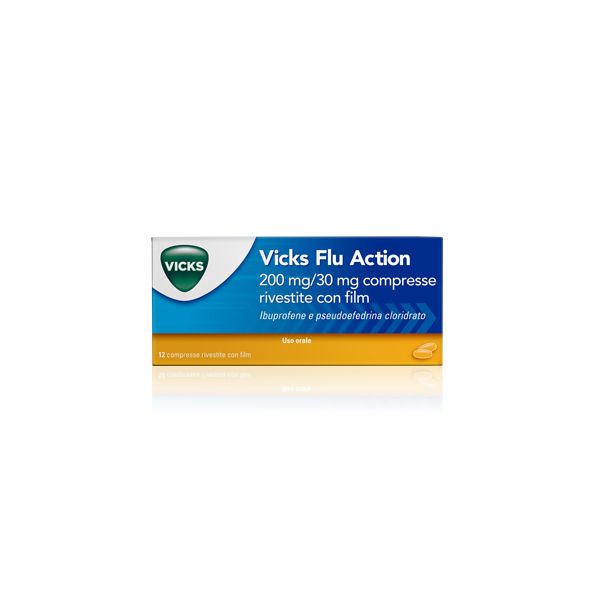 Vicks Flu Action 200 mg/30 mg compresse rivestite con film Ibuprofene e pseudoefedrina cloridrato Che cos’è e a che cosa serve Vicks Flu Action contiene i principi attivi ibuprofene, un farmaco antinfiammatorio non steroideo (FANS), e pseudoefedrina, che è un decongestionante nasale. • L'ibuprofene riduce il dolore, il gonfiore e la febbre alta. • La pseudoefedrina agisce sui capillari del naso per alleviare la congestione nasale. Vicks Flu Action è indicato per il sollievo sintomatico della congestione nasale con cefalea, febbre e/o dolore associati a raffreddore e influenza. Vicks Flu Action è indicato negli adulti e negli adolescenti di età superiore a 15 anni. Usi questo prodotto di associazione solo se ha il naso congestionato con dolore o febbre. Non usi questo prodotto se ha solo uno di questi sintomi. Si rivolga al medico se non si sente meglio o si sente peggio dopo 3 giorni negli adolescenti e 5 giorni negli adulti. Cosa deve sapere prima di prendere il medicinale NON prenda Vicks Flu Action se: - è allergico all'ibuprofene, alla pseudoefedrina o a uno qualsiasi degli altri componenti di questo medicinale (elencati al paragrafo 6); - ha un'età inferiore a 15 anni; - è in gravidanza o sta allattando; - ha avuto una reazione allergica (come respiro sibilante, broncospasmo, asma, poliposi nasale, prurito e naso gocciolante, gonfiore al viso, orticaria, o eruzioni cutanee) quando ha usato aspirina o altri antidolorifici, altri farmaci per la febbre o altri farmaci antinfiammatori; - ha (o ha avuto episodi ricorrenti) un'ulcera allo stomaco/duodenale (ulcera peptica) o sanguinamento (due o più episodi di ulcerazione diagnosticata o sanguinamento gastrico); - ha già avuto in precedenza una perforazione gastrointestinale o un sanguinamento correlato ai FANS; - ha sanguinamenti di altro tipo; - ha una grave insufficienza epatica; - ha una grave malattia renale acuta (improvvisa) o cronica (a lungo termine) o insufficienza renale; - ha una grave insufficienza cardiaca; - ha una pressione sanguigna molto alta (grave ipertensione) o ipertensione non controllata da farmaci; - ha gravi problemi cardiaci o circolatori (come ad esempio malattia coronarica, dolore al petto chiamato angina, battito del cuore accelerato), tiroide iperattiva (ipertiroidismo), diabete, feocromocitoma (un tumore della ghiandola surrenale); - ha avuto un attacco cardiaco (infarto miocardico); - ha avuto un ictus o è a rischio di ictus; - ha avuto le convulsioni; - ha qualche tipo di patologia del sangue inspiegata; - ha il glaucoma (pressione alta nell'occhio); - ha difficoltà ad urinare e/o la prostata ingrossata; - ha il Lupus eritematoso sistemico (LES) o Malattia mista del tessuto connettivo (MCTD), una malattia che colpisce il sistema immunitario e causa, per esempio dolore alle articolazioni e alterazioni della pelle; - sta prendendo: - aspirina (più di 75 mg al giorno) o altri farmaci antinfiammatori non steroidei (FANS) o altri antidolorifici, altri decongestionanti nasali come per esempio fenilpropanolamina, fenilefrina o efedrina o metilfenidato (vedere paragrafo Altri medicinali e Vicks Flu Action); - inibitori non selettivi delle monoaminossidasi (noti come IMAO e usati nel trattamento della malattia di Parkinson o della depressione) o li ha presi nelle ultime 2 settimane (vedere paragrafo Altri medicinali e Vicks Flu Action); - farmaci che fluidificano il sangue e impediscono la formazione di coaguli (anticoagulanti orali, eparine, agenti antiaggreganti); - corticosteroidi; - litio (usato nel trattamento del disturbo bipolare o della depressione); - inibitori selettivi della ricaptazione della serotonina (SSRI) (antidepressivi); - metotressato, usato a dosi superiori ai 20 mg alla settimana (farmaco immunosoppressore). Avvertenze e precauzioni Si rivolga al medico o al farmacista prima di prendereVicks Flu Action: - se soffre o ha sofferto di asma o malattia allergica; se è a rischio di un attacco d'asma; - se il medico le ha detto che ha un disturbo della coagulazione del sangue; - se ha una forma lieve o moderata e ben controllata di ipertensione (pressione alta del sangue), insufficienza cardiaca e di malattia del cuore (vedere anche paragrafo NON prenda Vicks Flu Action se); - se soffre di psicosi (malattia psichiatrica); - se ha una storia di malattia gastrointestinale (vedere anche il paragrafo NON prenda Vicks Flu Action se); - se ha problemi ai reni o al fegato lievi o moderati; - se sta prendendo medicinali contro l'emicrania; - Se ha un'infezione - vedere paragrafo Infezioni in seguito. Medicinali antinfiammatori/antidolorifici come Vicks Flu Action possono essere associati a un lieve aumento nel rischio di attacco cardiaco (infarto miocardico) o ictus, specialmente se usati ad alti dosaggi. Qualsiasi rischio è più probabile con alte dosi e un trattamento prolungato. Non superi la dose raccomandata o la durata raccomandata di trattamento. Vicks Flu Action deve essere sospeso se si manifesta aumento della pressione sanguigna, battito cardiaco accelerato e irregolare, nausea o qualsiasi evento neurologico come l'insorgenza o il peggioramento del mal di testa. Sono stati segnalati Casi di Sindrome da Encefalopatia Posteriore Reversibile (PRES) e Sindrome da Vasocostrizione Cerebrale Reversibile (RCVS) in seguito all'uso di farmaci contenenti pseudoefedrina. PRES e la RCVS sono condizioni rare che possono comportare un ridotto apporto di sangue al cervello. Smetta immediatamente di usare Vicks Flu Action e chieda assistenza medica immediata se sviluppa sintomi che potrebbero essere segni di PRES o RCVS (vedere paragrafo 4 Possibili effetti indesiderati per i sintomi). Segni di una reazione allergica a questo medicinale, inclusi problemi respiratori, gonfiore della regione del viso e del collo (angioedema), dolore toracico sono stati riportati con l'ibuprofene. Interrompere immediatamente l'assunzione di Vicks Flu Action e contattare immmediatamente il medico o il pronto socco